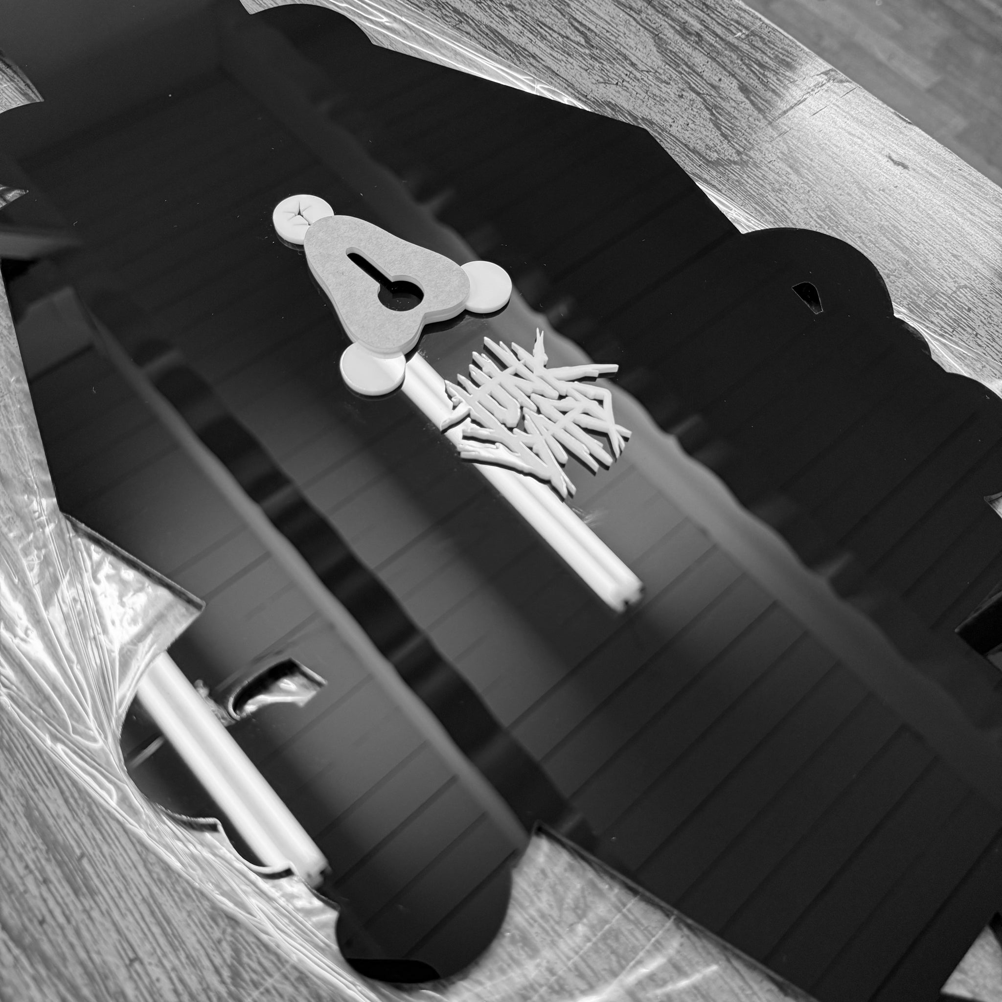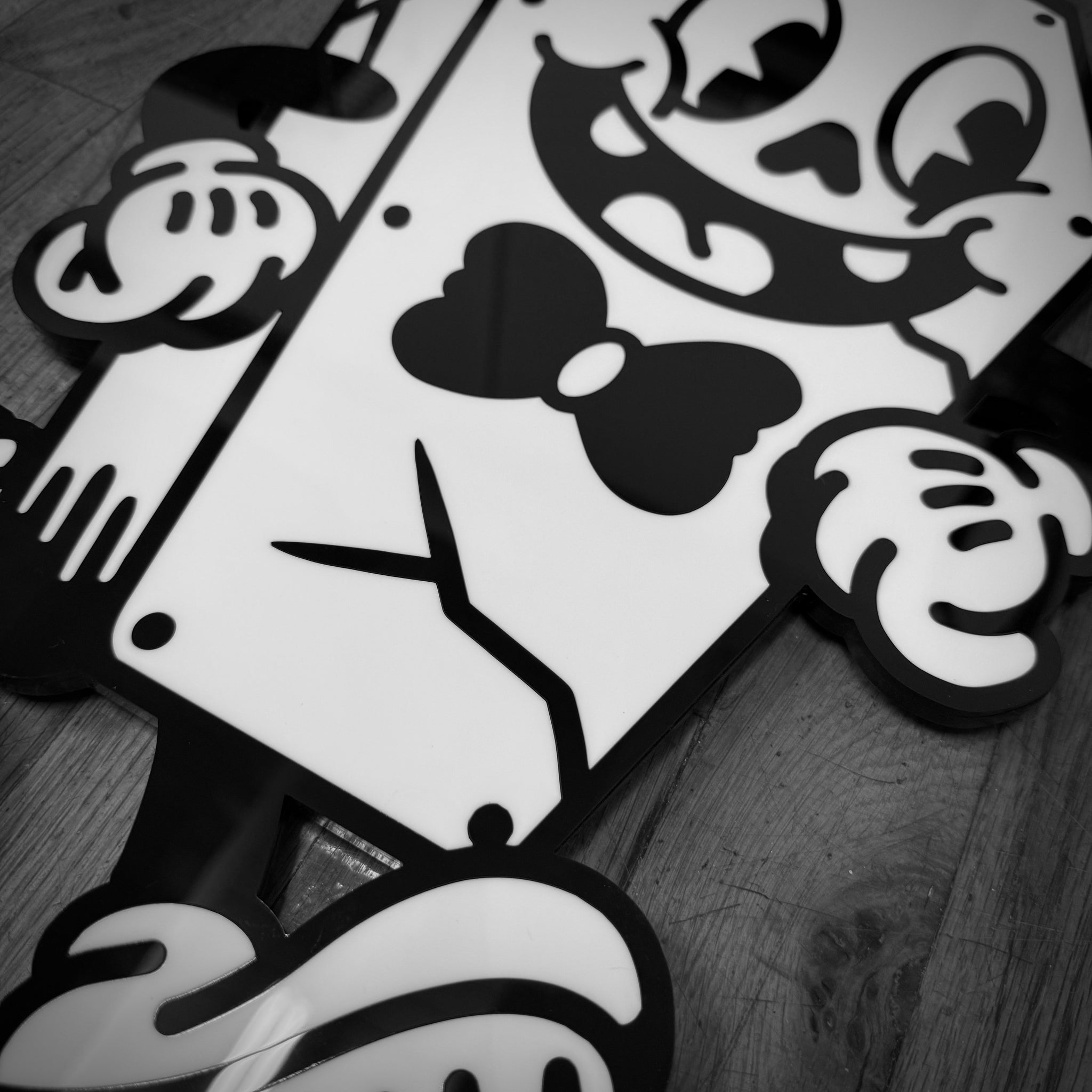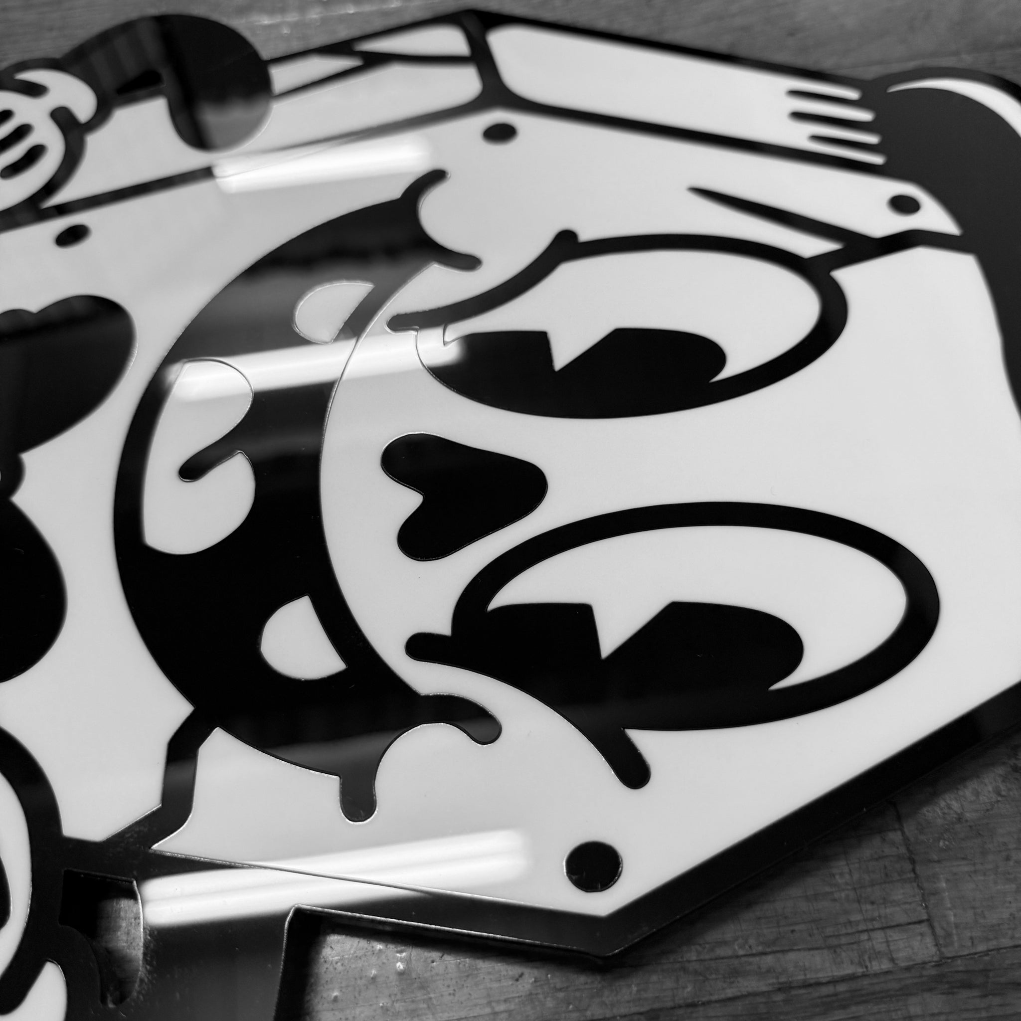 - Laser-cut black & white acrylic